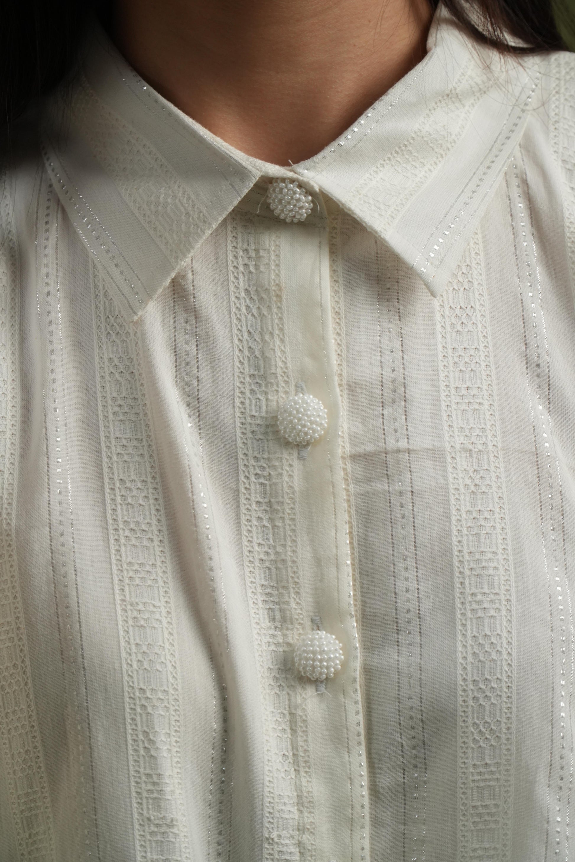 Cape Shirt: Button-down front with a structured collar, oversized draping sleeves, and lace-adorned edges for an ethereal look.